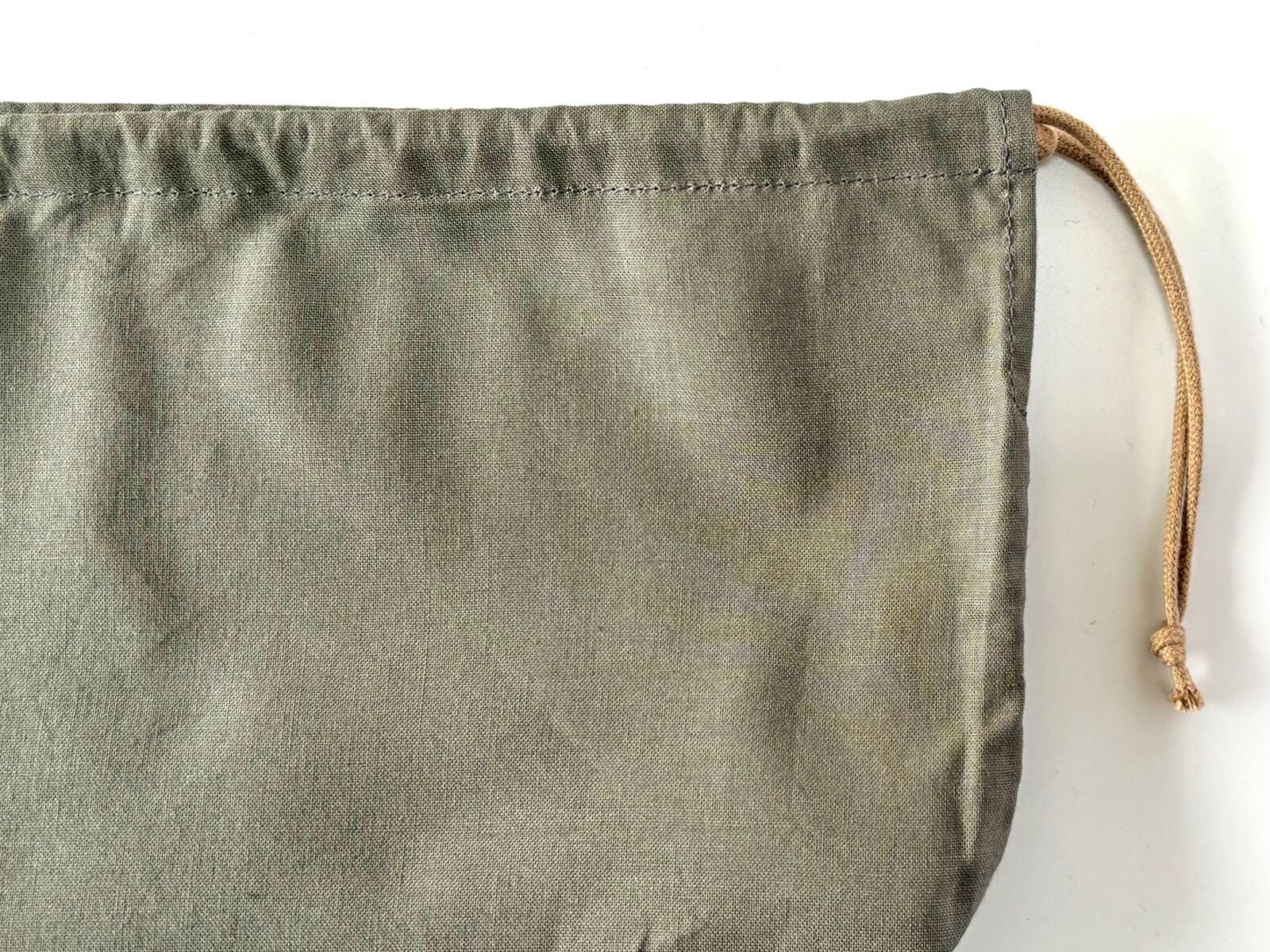 自然素材の魅力である独特のシワ感や色合い、使うほどに手に馴染んでいく質感や風合いの変化を楽しみつつ、「愛用の巾着」として育てていっていただければと思います。