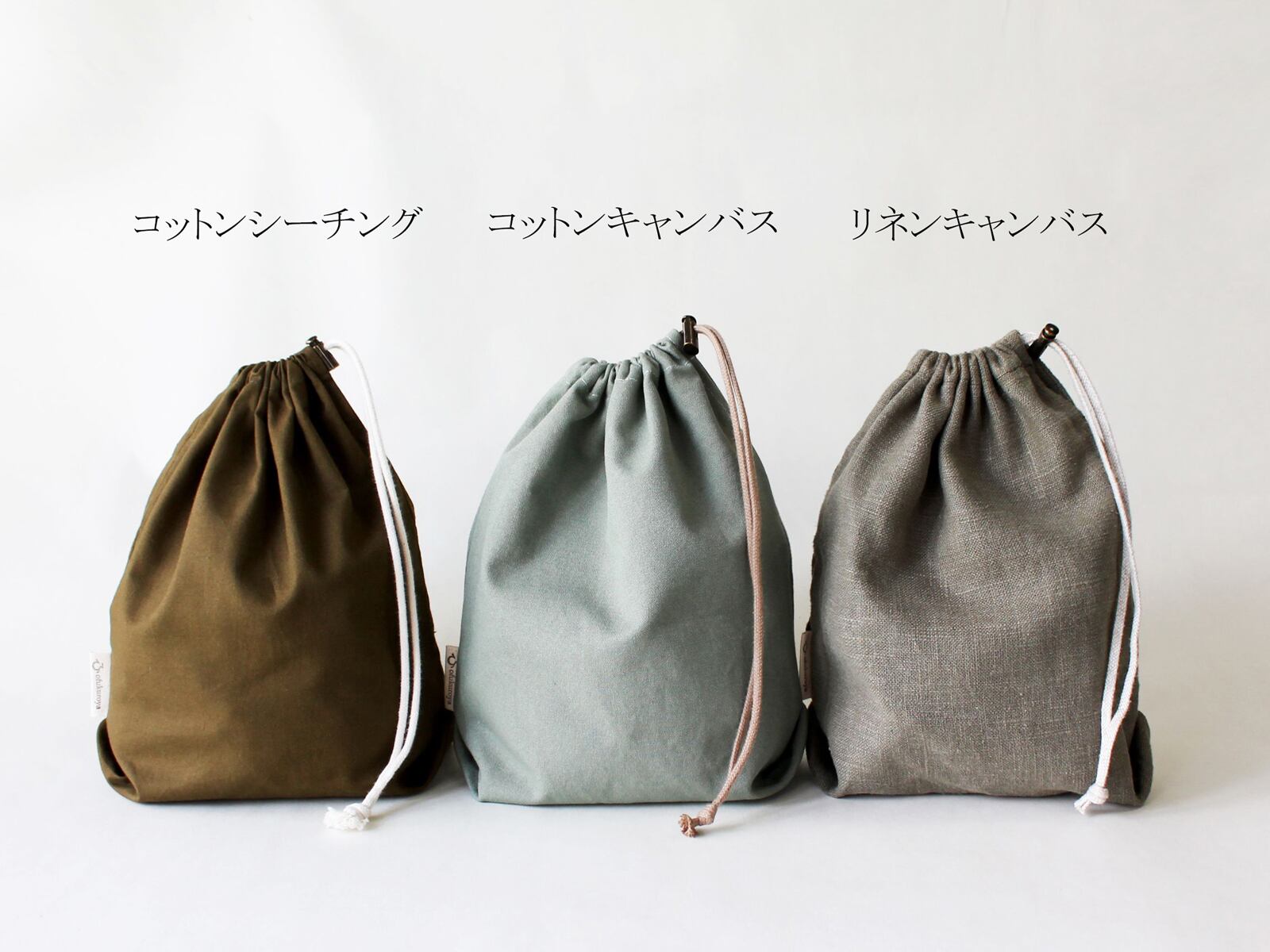 自然でさりげない、シンプルな基本の巾着袋、コットンシーチングタイプ。