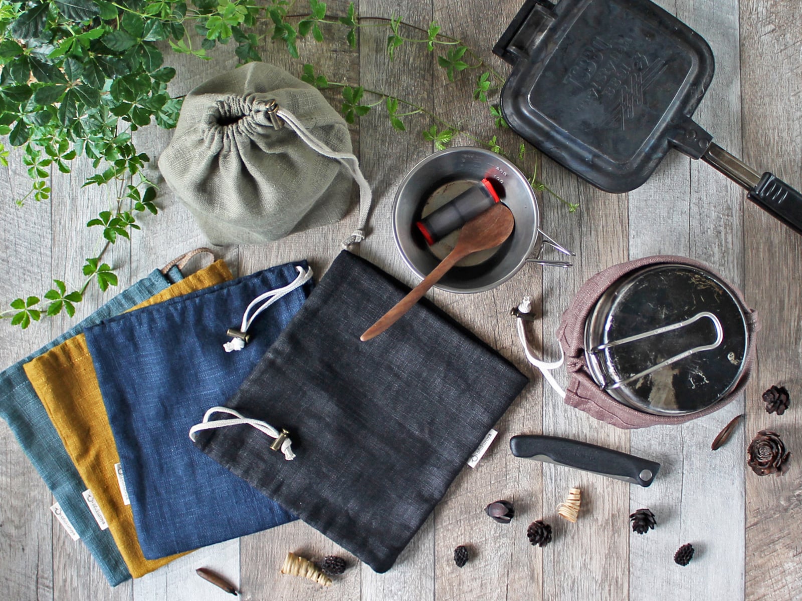 アウトドアギア専用収納袋「Kinchaku Outdoor」クッカー用、リネンキャンバスタイプ。