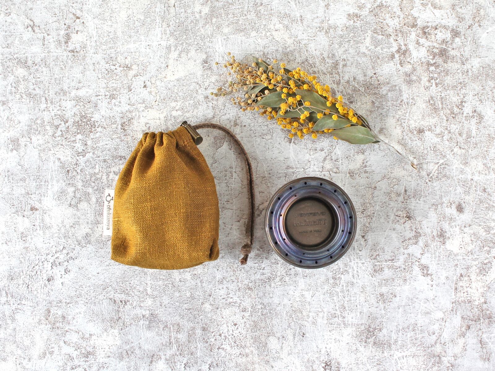アウトドアギア専用収納袋「Kinchaku Outdoor」リネンキャンバスタイプ、アルコールストーブ用(小)。