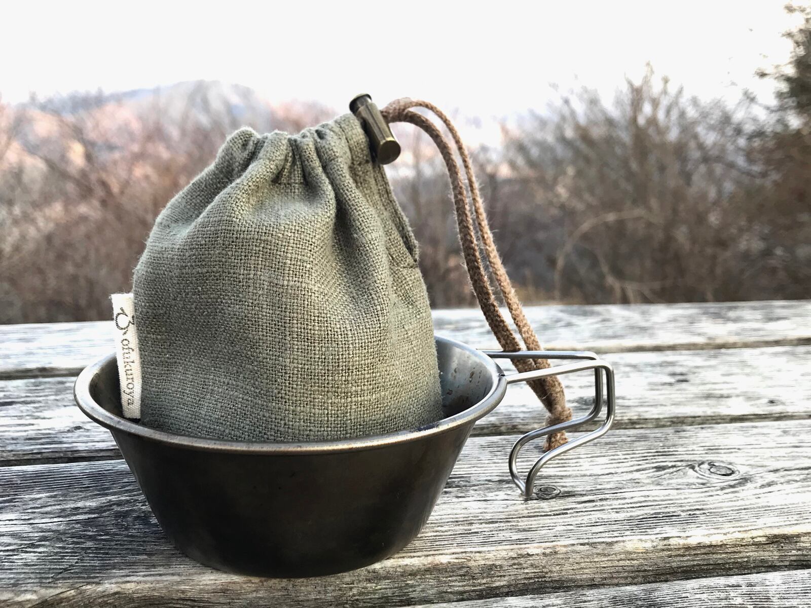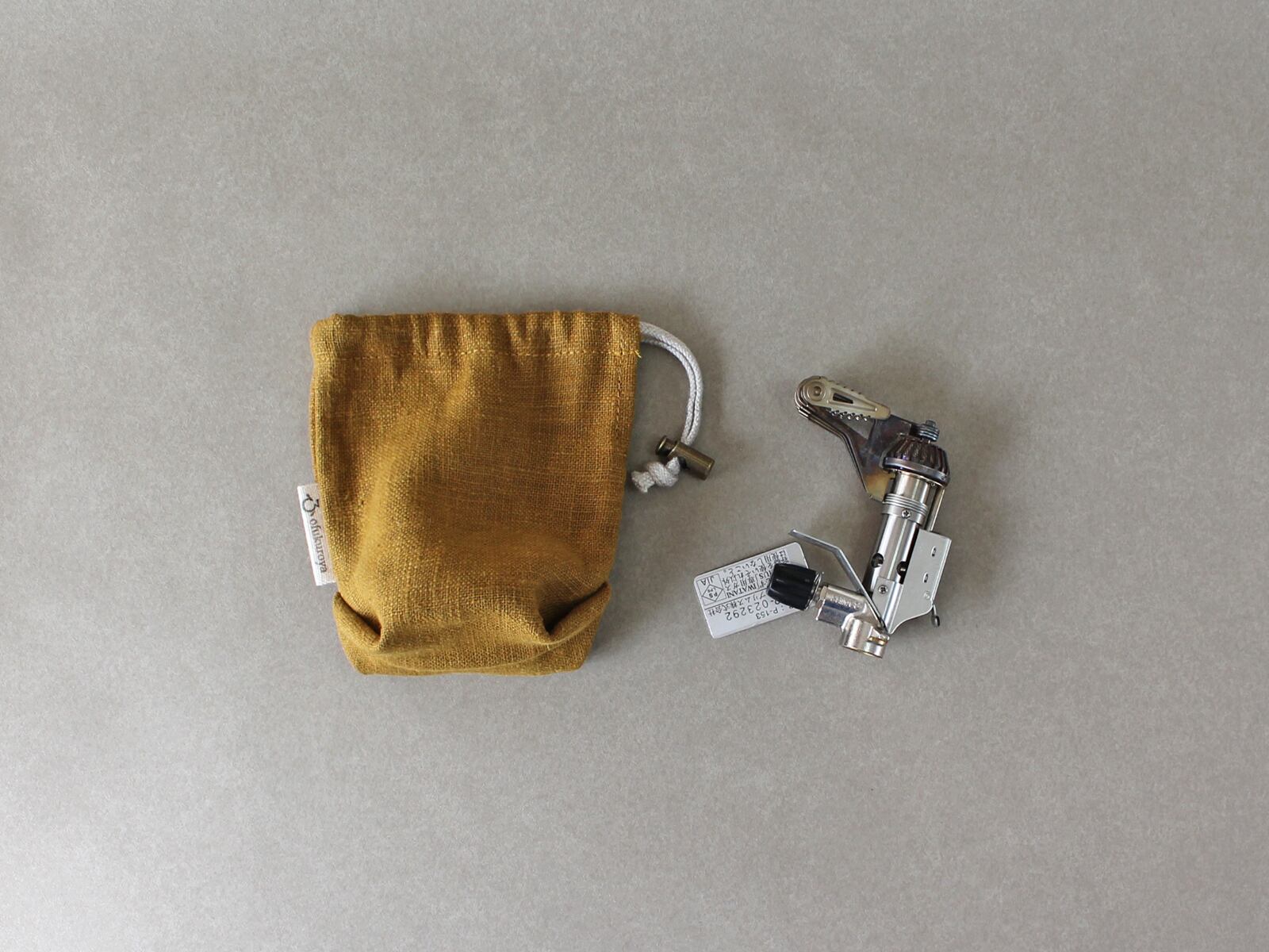 アウトドアギア専用収納袋「Kinchaku Outdoor」リネンキャンバスタイプ、アルコールストーブ用(大)。