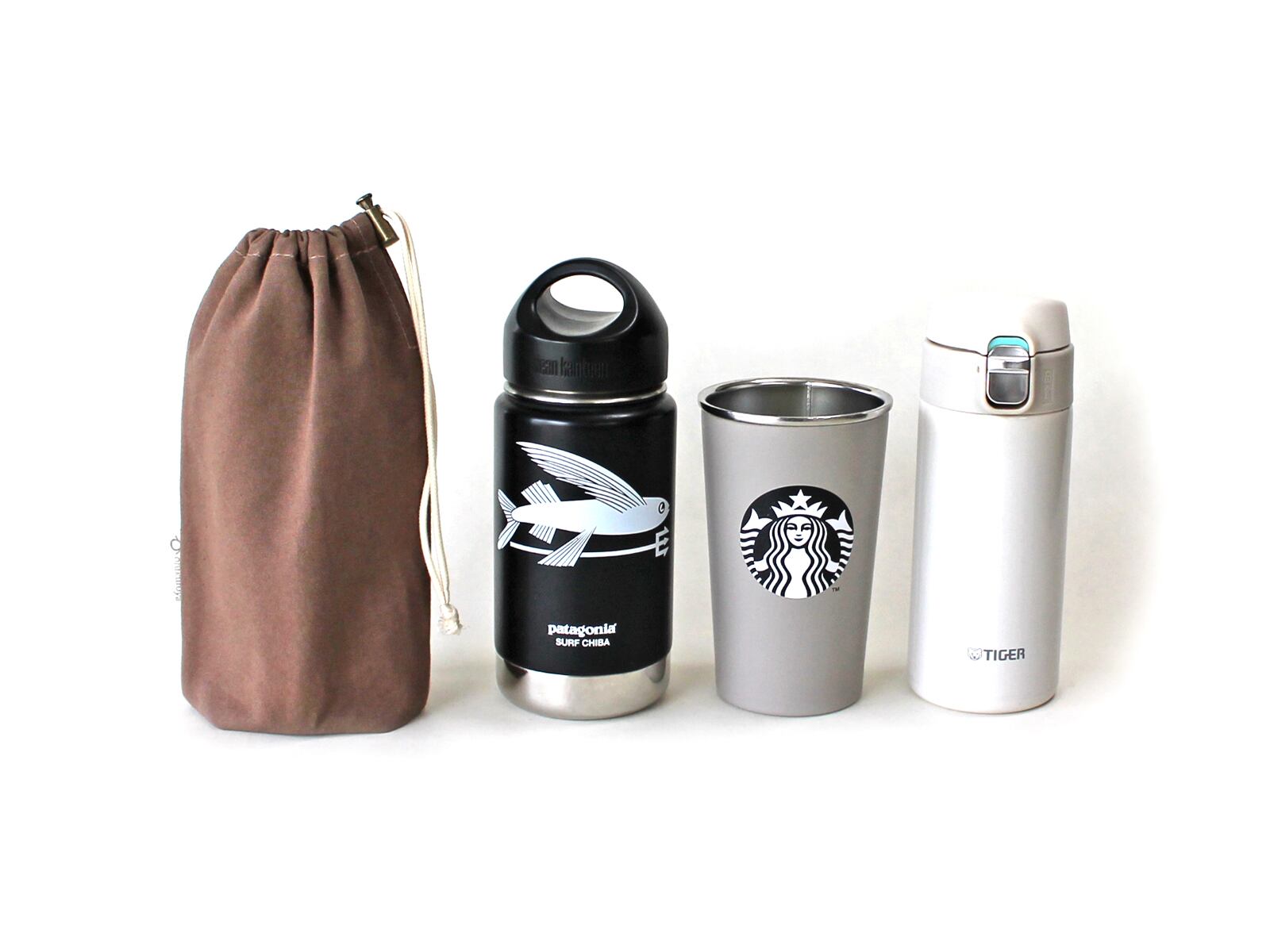 ※写真のタンブラー/ボトルは、Klean Kanteen ワイドインスレート ボトル 12oz/355m(φ75xH155mm)、スターバックス ステンレスカップ 355ml(φ79xH130mm)、タイガー ステンレスミニボトル 0.35L(φ66xH180mm)です。サイズに関してご不明な点はお問い合わせくださいませ。