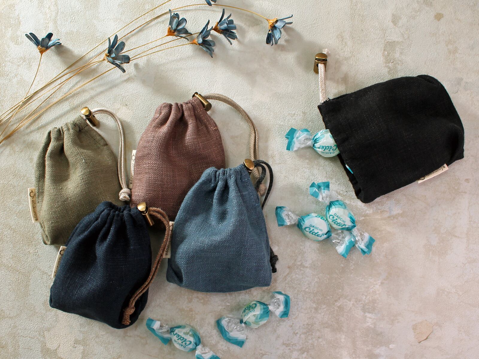 自然素材の魅力である独特のシワ感や色合い、使うほどに手に馴染んでいく質感や風合いの変化を楽しみつつ、「愛用の巾着」として育てていっていただければと思います。