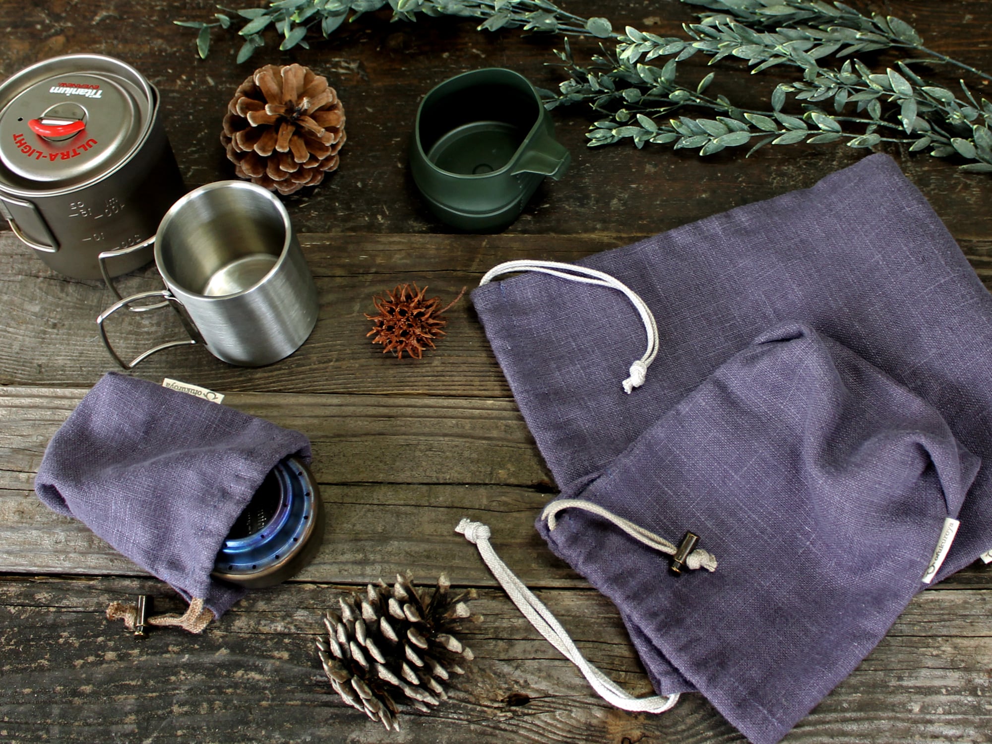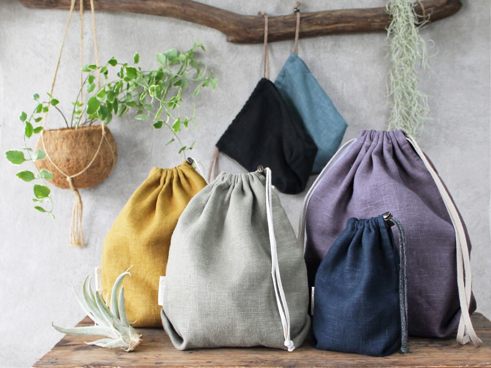 手に持った時にふと心が落ち着くような、温もりのある麻100%の天然素材の巾着袋です。