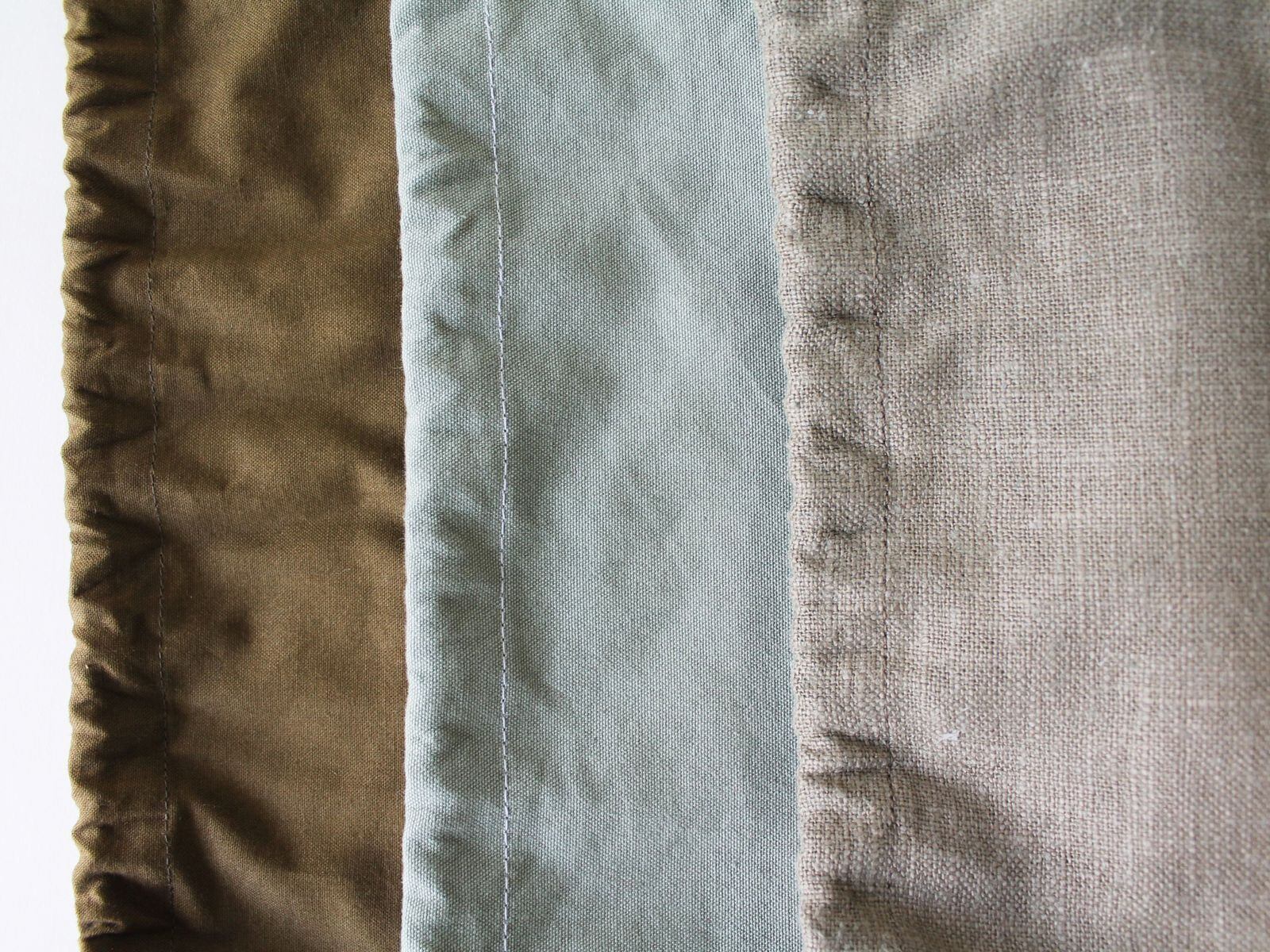 パリっとしたシワひとつない新品の生地とは違い、若干のシワ感がございますが、天然素材の製品を長く快適にご愛用いただく為の工夫ですので、何卒ご理解くださいますようお願い申し上げます。